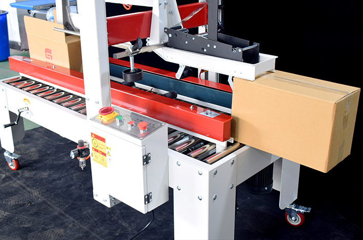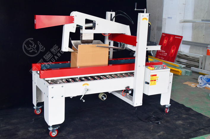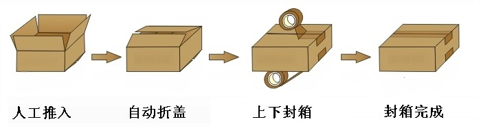 自動(dòng)折蓋封箱機(jī)配合流水線作業(yè)時(shí)只需將紙箱底部面形成的四面可彎折的面板折合,放入物品后輸入由兩側(cè)皮帶驅(qū)動(dòng)的輸送軌道內(nèi),封箱機(jī)上側(cè)的紙箱折蓋裝置啟動(dòng),折蓋封箱一次性完成。頂部自動(dòng)折合,自動(dòng)適時(shí)輸送,不用人手看管,適合接駁全自動(dòng)生產(chǎn)線。