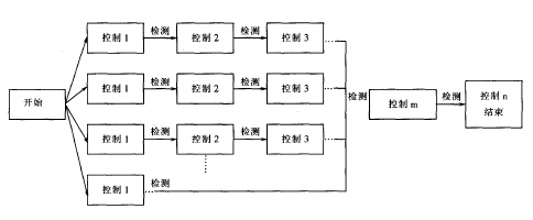參照下圖,若第一條控制鏈上l代表藥品計(jì)量操作控制,3代表傳動(dòng)控制。第二條控制鏈上2代表說明書進(jìn)給操作控制。第三條控制鏈上1代表包裝材料小紙盒的進(jìn)給控制,最后一條鏈上1代表紙箱的進(jìn)給操作控制。m代表包裝動(dòng)作的執(zhí)行控制,再經(jīng)過貼標(biāo)簽,最后輸出成品,完成整個(gè)包裝過程。