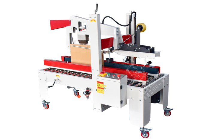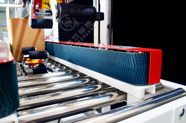 自動(dòng)折蓋封箱機(jī)配合流水線作業(yè)時(shí)只需將紙箱底部面形成的四面可彎折的面板折合,放入物品后輸入由兩側(cè)皮帶驅(qū)動(dòng)的輸送軌道內(nèi),封箱機(jī)上側(cè)的紙箱折蓋裝置啟動(dòng),折蓋封箱一次性完成。頂部自動(dòng)折合,自動(dòng)適時(shí)輸送,不用人手看管,適合接駁全自動(dòng)生產(chǎn)線。